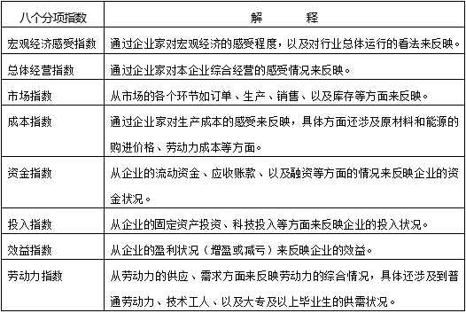 在行業選取的過程中,依據國民經濟各行業對GDP的貢獻度,共選取了工業、建筑業、交通運輸郵政倉儲業、房地產業、批發零售業、社會服務業、信息傳輸計算機服務和軟件業、住宿餐飲業等八大行業。每個行業的調查內容,具體包括八個大的分項:宏觀經濟感受、總體經營、市場、成本、資金、投入、效益、勞動力。在具體調查過程中,考慮到不同行業的特點,八個大的分項里的細項調查有所區別。